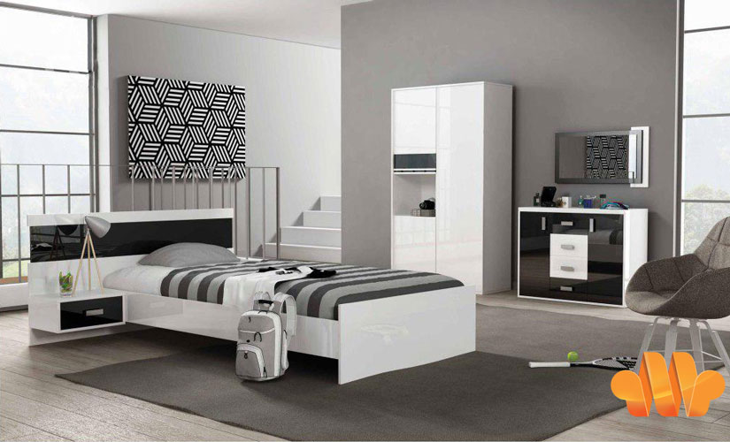 رنگ سفید برای هر سبک سلیقه ای مورد استفاده قرار می گیرد و همین امر سبب استقبال بسیار زیاد از این رنگ شده است. شما می توانید با استفاده از یک تخت خواب یک نفره کار دیزاین اتاق فرزند خود را به بهترین شکل با هر تم رنگی به انجام برسانید؛ زیرا رنگ سفید دست شما را در انتخاب رنگ سایر لوازم دکوری بسیار باز می گذارد. استفاده از یک درآور ساده و میز توالت و آینه همراه این سرویس خواب شیک را برای دختر خانم های جوان و دانشجوهای خوش سلیقه بهترین گزینه انتخابی قرار داده است. می توانید از تم های رنگی مشکی طلایی برای جلوه دادن به این چیدمان بهره بگیرید تا دوستان خود را در بدو ورود به اتاق خوابتان شگفت زده کنید.
