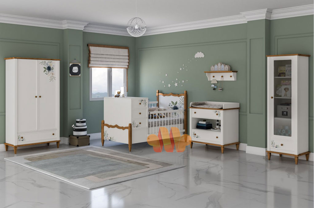 سرویس خواب نوزاد سفید، با ظاهری ملایم و دوستداشتنی، فضایی آرامشبخش و رویایی برای خواب راحت و آسوده نوزاد شما فراهم میکند. این رنگ خنثی، با هر نوع دکوراسیونی به راحتی ست میشود و فضایی دلباز و روشن در اتاق نوزادتان ایجاد میکند. در قسمت هایی از این سرویس از چوب بلوط استفاده شده و با برچسب های گل تزیین شده که زیبایی آن را دو چندان کرده است. سرویس خواب نوزادی لیلیوم از ام دی اف با اتصالات الیت ساخته شده و دارای تخت دو منظوره، کمد، ویترین و میز تعویض بوده که در سبد خرید قرار گرفته.