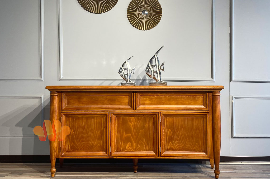 سه درب در قسمت پایین کار و دو کشو در بخش بالایی با فضا سازی بسیار ایده ال برای شما فراهم شده است. از کشو برای وسایل پذیرایی که مدام به آن نیاز دارید و از کمد ها برای جایگذاری وسایل قدیمی که به ندرت از آن استفاده می کنید می توانید کمک بگیرید. فضای روی کار نیز با حذف آینه بخش بسیار ویژه ای را برای قرار دادن ظرف و ظروف قدیمی و لاکچری شما فراهم کرده است.