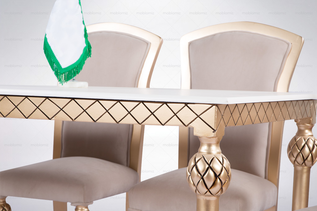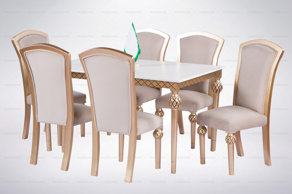 میز نهارخوری کلاسیک دل آرا ست با مبل کلاسیک دل آرا پیشنهاد میکنیم این سرویس نهارخوری زیبا را با رنگ طلایی سفارش دهید در صورت نیاز به مبل نیز بر روی لینک کلیک کنید قیمت در روی سایت برای چهارنفره محاسبه شده که میتوانید سفارش را تغییر دهید