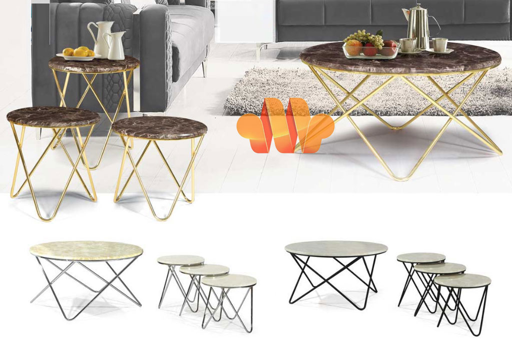 جلو مبلی و سه عدد عسلی از جنس فلز بارنگ طلایی آبکاری شده و صفحه رویی از جنس وکیوم با طرح سنگ این سرویس زیبا به صورت تکی فروخته نمی شود