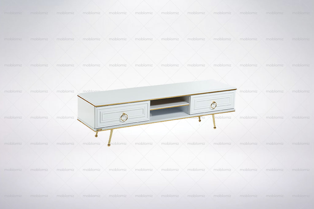میز تلویزیون کد 69 از ام دی اف با پایه هایی فلزی ساخته شده است که میتوانید در طول 140 و 160 سفارش دهید عرض این محصول 36 بوده و دارای دو عدد کشو و دو جای رسیور میباشد پایه ها فقط به رنگ طلایی سفارش گرفته میشود