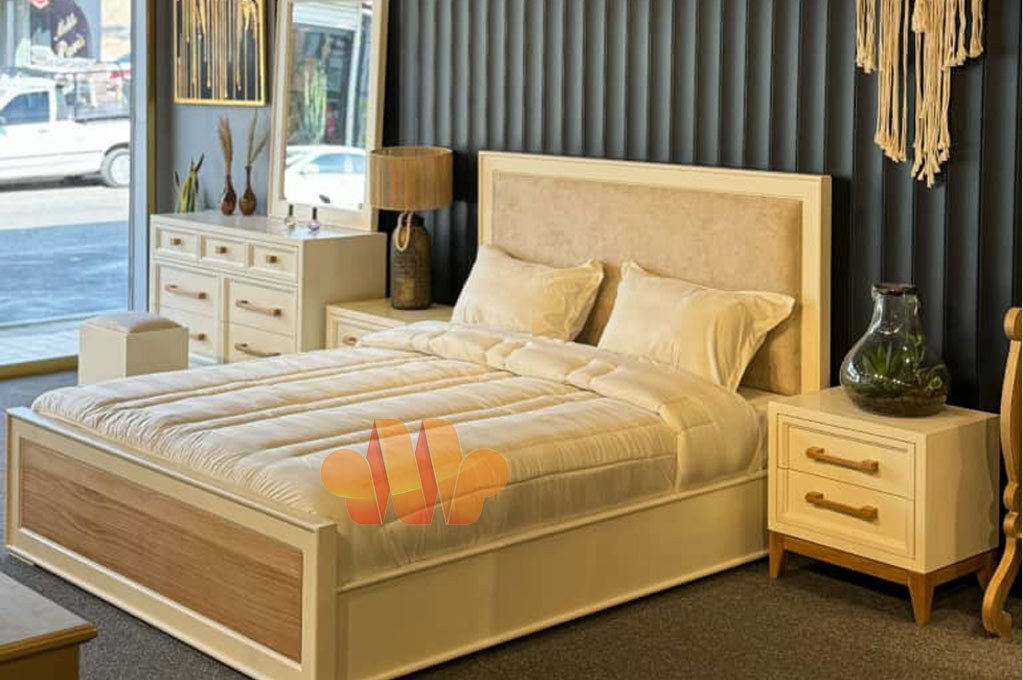 این سرویس شامل تختخواب دو نفره با طراحی خاص و استراکچر مستحکم، دو عدد پاتختی با پایههای چوبی، یک دراور با آینه ایستاده و کشوهای جادار است که نظم و زیبایی را همزمان به اتاق خواب شما میآورد. نورپردازی محیط، دیوارپوشهای عمودی تیرهرنگ و دکور دستبافت دیواری، فضای عکس را به یک نمونه ایدهآل از چیدمان حرفهای تبدیل کردهاند.