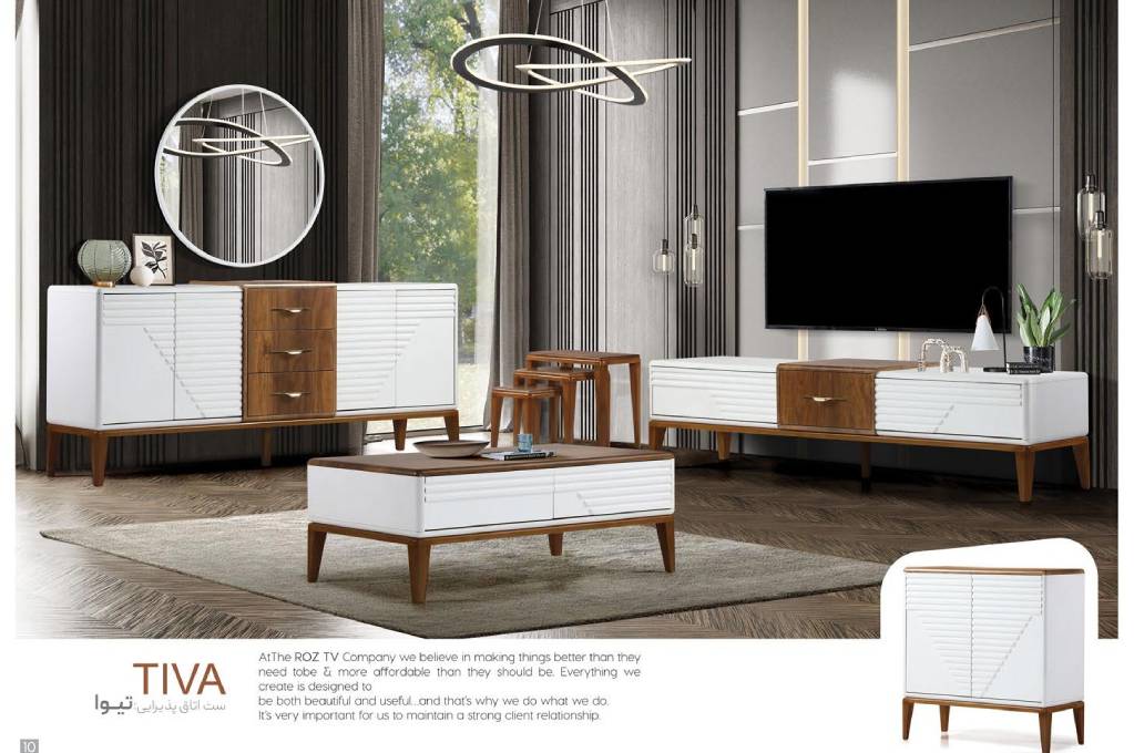 ست پذیرایی تیوا با خطوط مورب و طراحی خاص دربها، حس مدرنیته و نظم را در نگاه اول منتقل میکند. تلفیق رنگ سفید مات با چوب قهوهای، ظاهری گرم و شیک ایجاد کرده که بهخوبی با فضاهای مینیمال و امروزی هماهنگ میشود. این ست شامل میز تلویزیون، میز جلومبلی، عسلی و کنسول با آینه گرد است و با پایههای باریک و کشوهای مرکزی چوبی، جلوهای زیبا و دلنشین دارد. استفاده از MDF مرغوب در ساخت آن، تضمینکننده دوام بالا و زیبایی در بلندمدت است. اگر به دنبال ستی خاص و متفاوت برای سالن پذیراییتان هستید، تیوا انتخابی جسورانه و جذاب است.
